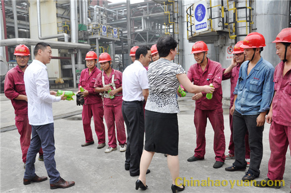 赵志贺、房继红与公司员工代表一一握手慰问,并为员工送上防暑饮料。