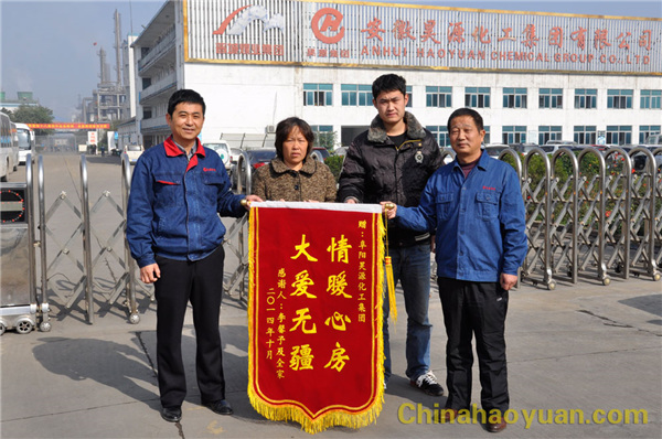 11月6日上午,阜阳市颍州区办事处沿河村前小庄村民李馨予一家人带着锦旗来到昊源集团,向伸出援助之手的企业表示感谢。