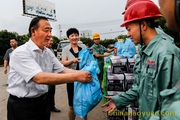 孙正东一行在凡殿才等公司领导陪同下,来到航天炉生产系统,慰问正在生产岗位工作的昊源干部、员工,关切地询问他们的工作、生活情况,叮嘱他们注意高温作业安全,并亲自将防暑降温用品送到他们手里。