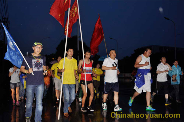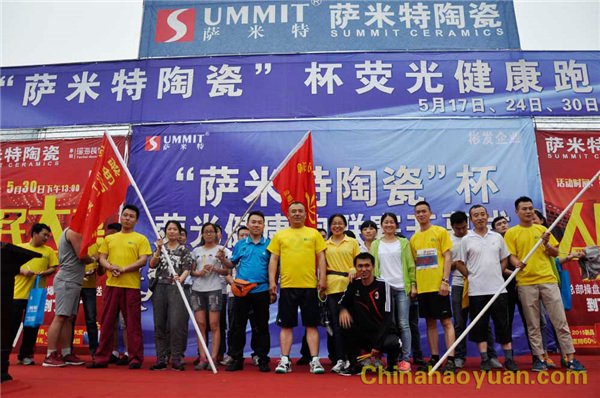 在荧光跑开幕式现场,昊源集团的参赛队伍最为耀眼。两面昊源大旗迎风飘扬,“奔跑吧,昊源”是我们的口号,“健康生活、快乐运动”是我们的主题,“绿色化工、美好生活”是我们的品牌形象。