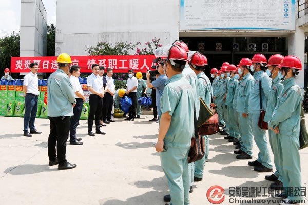 8月17日,市委副书记李军,市总工会党组书记、副主席房继红一行,带着矿泉水、绿茶饮品、绿豆、风油精、毛巾等消暑物品,到昊源公司开展“夏送清凉”活动,看望慰问在酷暑中坚守岗位的一线劳动者。昊源公司党委书记、董事长凡殿才,党委副书记、工会主席高玉磊,副总经理张海生陪同慰问。