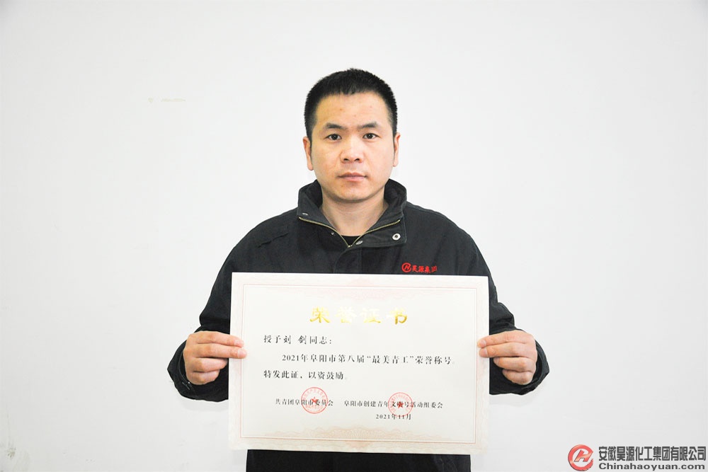 近日,昊源公司园区合成工段刘剑同志被共青团阜阳市委员会、阜阳市创建青年文明号活动组委会评为阜阳市第八届“最美青工”荣誉称号。