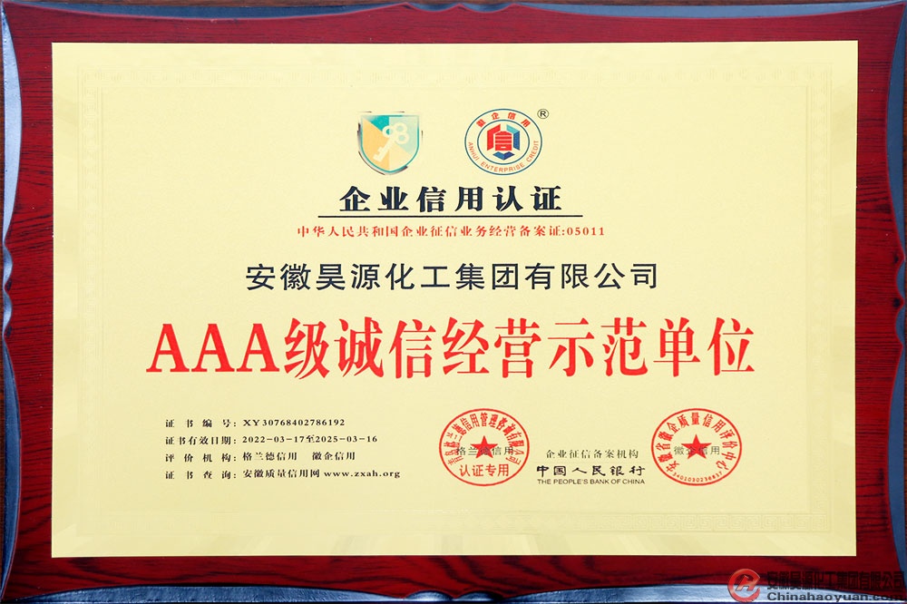 安徽省徽企质量信用评价中心依据GB/T23791-2009《企业质量信用等级划分通则》,通过基本信息、政府监管、媒体信息、企业资质、质量检查、法院判决、知识产权、社会责任、企业运营等信用信息,进行客观独立的集成、分析和评定。针对公司的信用记录,经营状况、财务指标、发展前景,结合国家及地方相关政策,本着公平、公正、独立、客观、科学原则,评定安徽昊源化工集团有限公司为AAA级诚信经营示范单位,并为公司颁发了牌匾及证书。