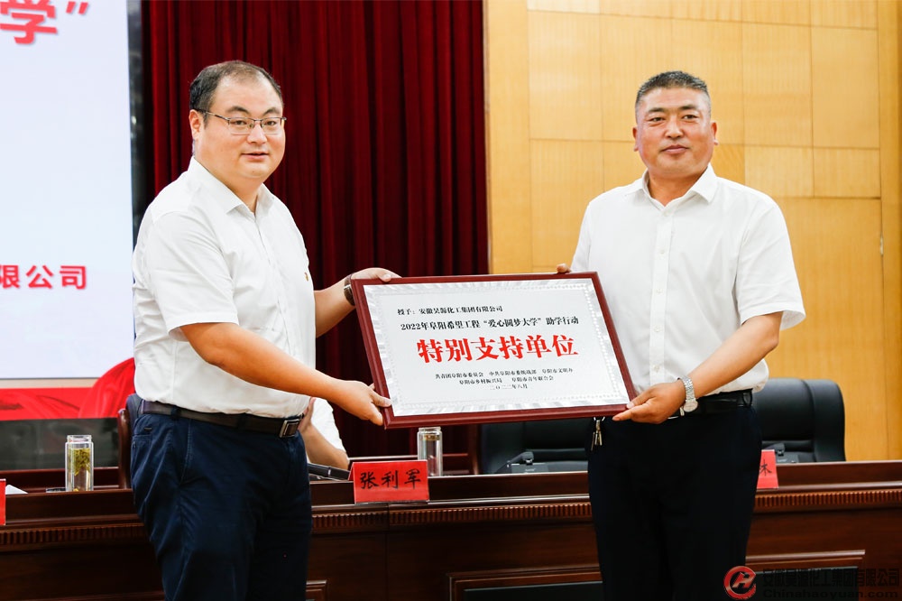 随后,团市委书记汝磊向昊源公司颁发2022年阜阳希望工程“爱心圆梦大学”助学行动特别支持单位奖牌,感谢昊源公司多年来对爱心助学行动等公益事业的大力支持。