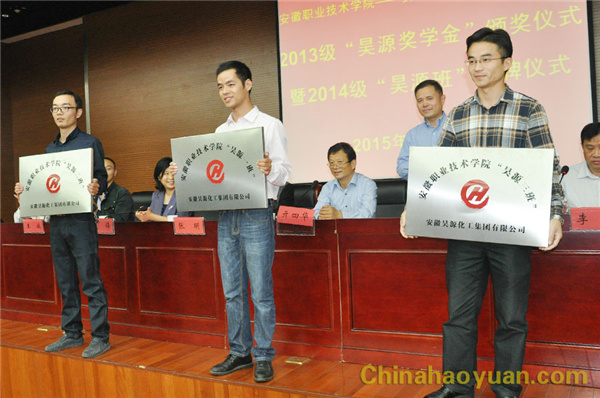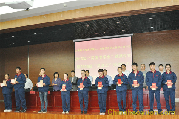 10月23日,安徽职业技术学院2013级“昊源奖学金” 颁奖仪式暨2014级“昊源班” 授牌仪式在安徽职业技术学院图书馆三楼报告厅隆重举行。公司副总经理杨捷、企管处处长张明、扩建办副主任沈献、安徽职业技术学院院长亓四华、副院长史锋、化学工程系主任方向红等出席颁奖授牌仪式。