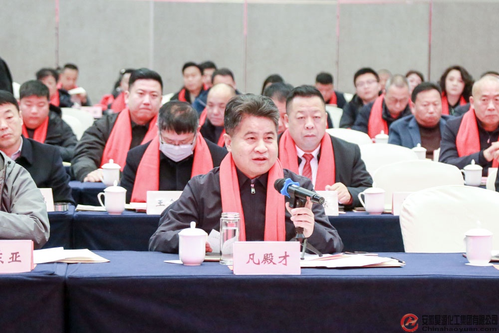 凡殿才在发言中简要汇报了昊源公司过去一年的生产经营情况。他表示,面对日益激烈的市场环境,企业家们都在为生存而不懈努力。昊源公司始终秉持合作共赢的宗旨,与上下游产业企业相互支持、协同发展、共享资源,凝聚各方合力,携手抵御市场风险。