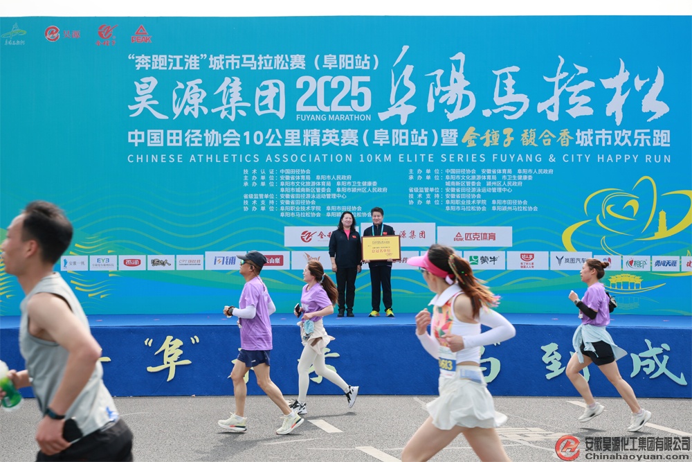 在企业授牌环节,市领导代表昊源集团2025阜阳马拉松官方授予安徽昊源化工集团有限公司总冠名单位奖牌。