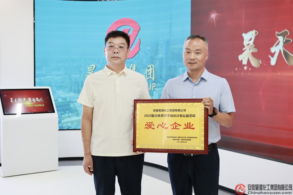优秀学子参观昊源展厅,深入了解昊源公司发展历程、产业布局、科技创新等情况。刘振亚为优秀学子颁发励志助学金,安徽昊源化工集团有限公司被授予“爱心企业”光荣称号。