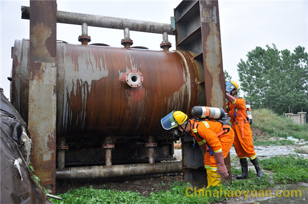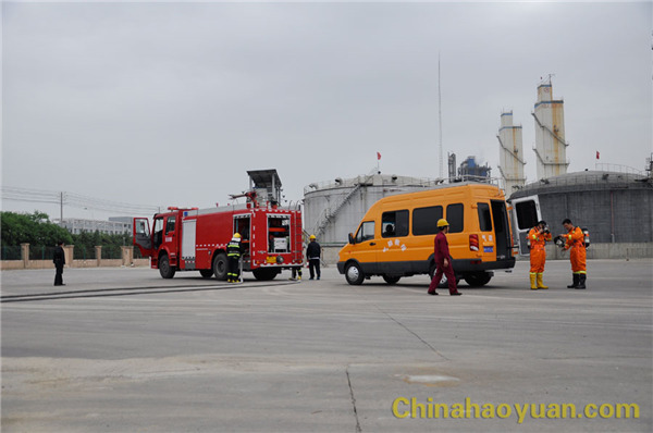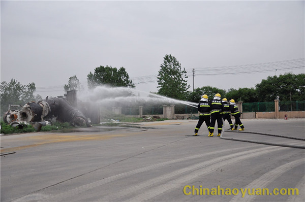 演练以航天炉系统甲醇罐区西部设备着火为假想,进行及时扑灭着火,并对着火现场进行人员搜救。