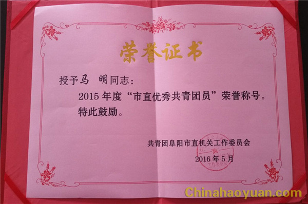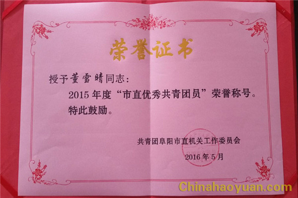 2015年,昊源公司青年员工立足岗位认真工作,走出公司服务社会,受到社会各界好评,喜获阜阳团市委多项荣誉。 航天炉气化车间董雪晴获得阜阳市直优秀团员、净化车间马明获阜阳市优秀共青团员荣誉称号,电仪团支部获得阜阳市直“五四红旗团支部”荣誉称号。荣誉是对昊源青年员工工作的肯定,也是对未来工作的鞭策。