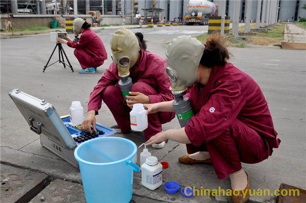 随着演练开始口令下达,氨库冲装人员发现3#储氨罐顶部漏氨,便立即向车间报告液氨泄露情况。随后,车间快速向安全科及生产办汇报,公司迅速启动危化品泄露事故专项应急预案,并在联合车间成立指挥部。总指挥李超群在向联合车间主任苗田生了解情况后,立即通知各救援队紧急向指挥部集合。人员迅速集合到位,李超群当即下达救援命令。安全科人员紧急疏散下风口人群,保卫科在现场拉起隔离带禁止无关人员进入,公司消防队利用现场高压水枪对泄露液氨进行吸收、压制,防止氨气进一步扩散。联合车间主任苗田生收到总指挥下达的抢险任务后,立即安排两名操作工及两名维修工赶往球罐顶部,在水枪的喷射配合下,抢险队员一鼓作气冲向漏点迅速将泄漏点根部阀门关闭,泄露消除。环保科人员现场进行废水及空气检测,并将检测结束随时报告指挥部。险情排除,环境检测合格,随即集合队伍,总指挥李超群下达结束紧急状态命令,并要求安全科调查本次泄露事故原因,做好警示教育,演练结束。