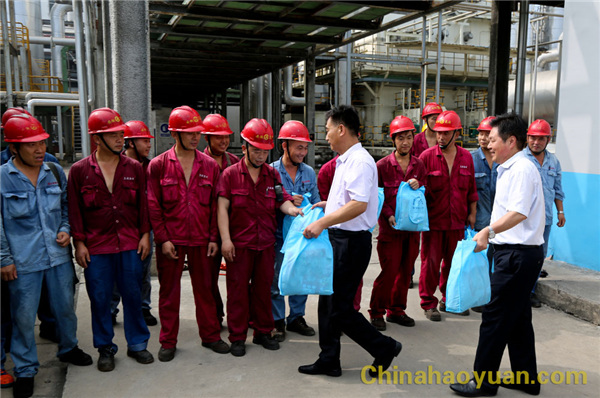 8月23日,阜阳市总工会党组织成员、经审会主任吴燕,劳动保障部长徐彪一行,带着矿泉水、绿豆、清凉大礼包等防暑降温用品,深入昊源公司生产一线,为高温期间坚守生产岗位一线员工送去清凉。公司副总经理、工会主席高玉磊,总经理助理吴珍汉陪同。