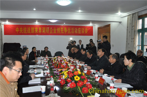 座谈会上,市委书记、市人大常委会主任宋卫平汇报了我市及非公有制经济组织创先争优活动开展情况。他说,创先争优活动开展以来,按照中央、省委和市委的要求,阜阳市以“为科学发展创先进,为阜阳崛起争先锋”为主题,大力弘扬沈浩精神、王家坝精神,注重把创先争优落实到具体岗位和日常工作,加强领导、周密部署、扎实推进,全市创先争优活动有序推进,特色鲜明,进展顺利,成效明显。市委高度重视非公经济组织创先争优活动,把它作为推动企业科学发展、加强企业党的建设、促进劳动关系和谐的重要工作来抓;非公企业党组织和广大党员紧扣“促进生产经营、凝聚职工群众”的实践主题,坚持把弘扬沈浩精神和王家坝精神贯穿始终,注重把创先争优落实到具体岗位和干事创业上,使活动为企业所需要、党员所欢迎、职工所拥护、业主所支持。