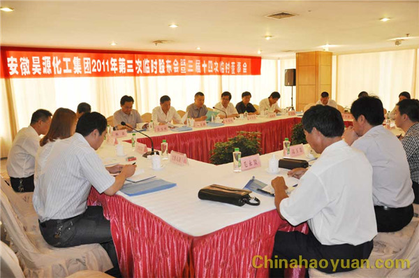 7月19日上午,昊源集团公司2011年临时股东会暨三届董事会第十四次临时会议在阜阳市国际大酒店隆重召开。出席此次会议的有晋煤集团巡视办巡视二组组长王建国等领导,参加会议的有,昊源集团公司股东和股东代表、公司董事、监事。会议由公司董事长郑高潮先生主持。 此次会议审议通过了《《关于改选公司董事长的议案》等五项议案。