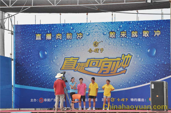 《直播向前冲》是阜阳广播电视台推出的第一档大型水上竞技娱乐节目,选手以个人形式参加挑战,挑战过程中设有“无敌水上漂”、“忐忑摇摆锤”、“幸运大转盘”等6道关卡。拍摄基地设在颍东区碧翠湖生态农庄内,参与闯关的选手,必须在120秒时间内闯完全部关卡,中途落水或超过规定时间即视为闯关失败,闯关成功者将获得《直播向前冲》栏目组提供的丰厚大奖。