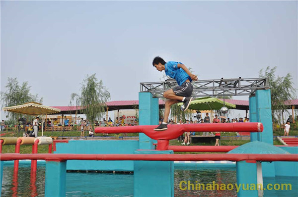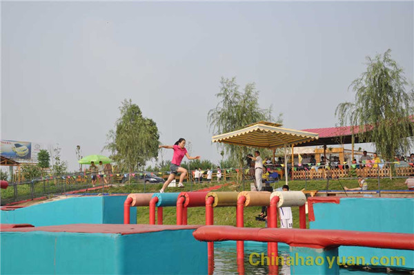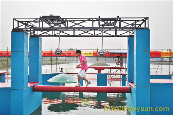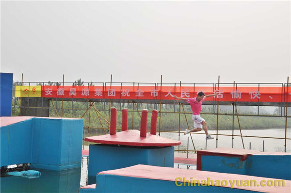 随着现场冲关哨声响起,尿素车间杨磊作为第一位冲关选手,如离弦之箭冲上 “水上传送带”,亲身体验了 “水上漂”的感觉。在“忐忑摇摆锤”面前,他毫无忐忑之心,一溜烟地跑到“幸运大转盘”上, “幸运大转盘”上,天地混为一体,天旋地转,他一个箭步就跳上 “水上旋转木”。一路上他“过五关斩六将”,时间就是速度,一转眼他便到达终点,敲响了胜利的锣鼓。