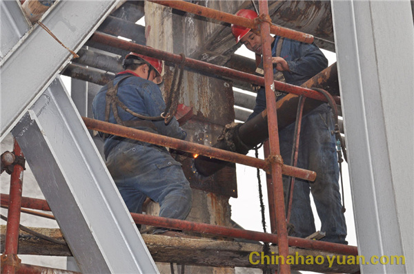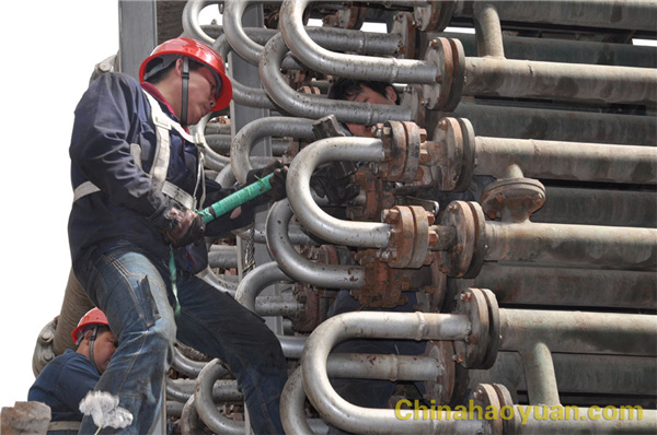 ③、维修人员在为设备加固。 ④、维修人员在疏通循环水管道。