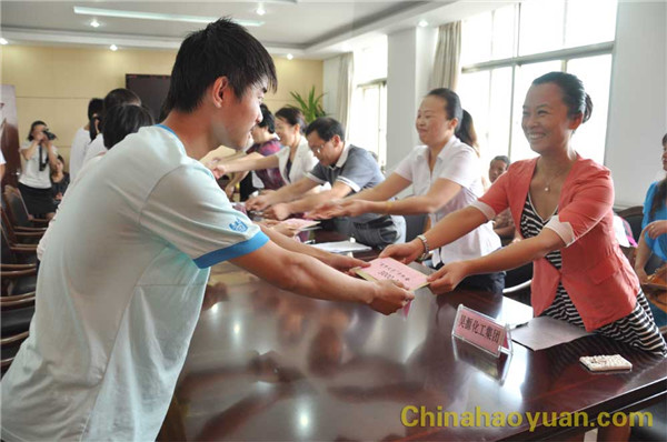 8月29日,市直团委“爱心圆满大学”助学金发放仪式在市团委举行。 图为,昊源集团团委书记冯婷婷为昊源学子发放助学金。