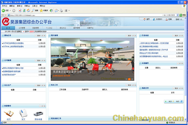 在公司领导的高度重视和各部门人员的紧密配合下,昊源集团OA办公系统经过北京普巴安徽分公司技术人员紧张有序地程序研发、修改完善、测试调试, 11月1日,该系统正式上线试运行。系统包含公文管理、信息管理、个人办公、综合办公、邮件管理、沟通平台六个模块。OA办公系统的成功上线将进一步提高公司现代化信息管理水平和决策效率。同时,将为公司的高效办公,工作流程标准化、制度化奠定坚实基础。