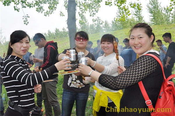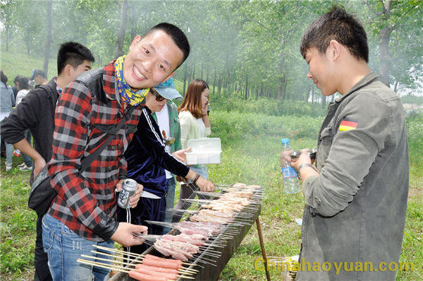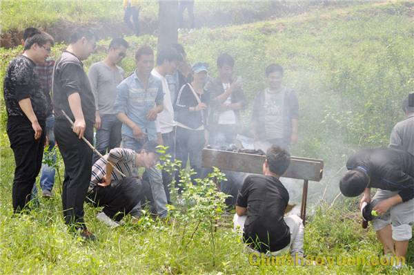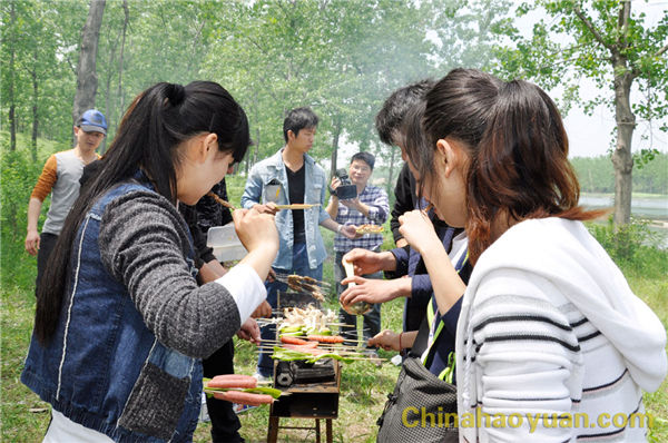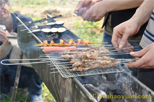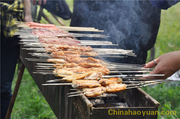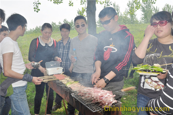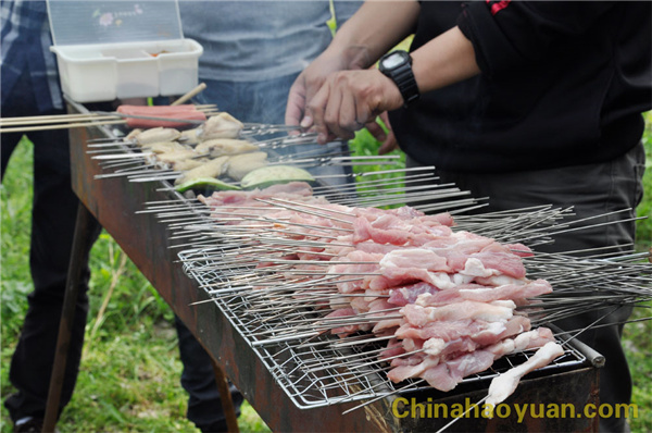 稍作休息,大家便开始了此次烧烤活动的准备工作,拾柴火、生炉子、串肉串,一片热火朝天的忙碌景象。