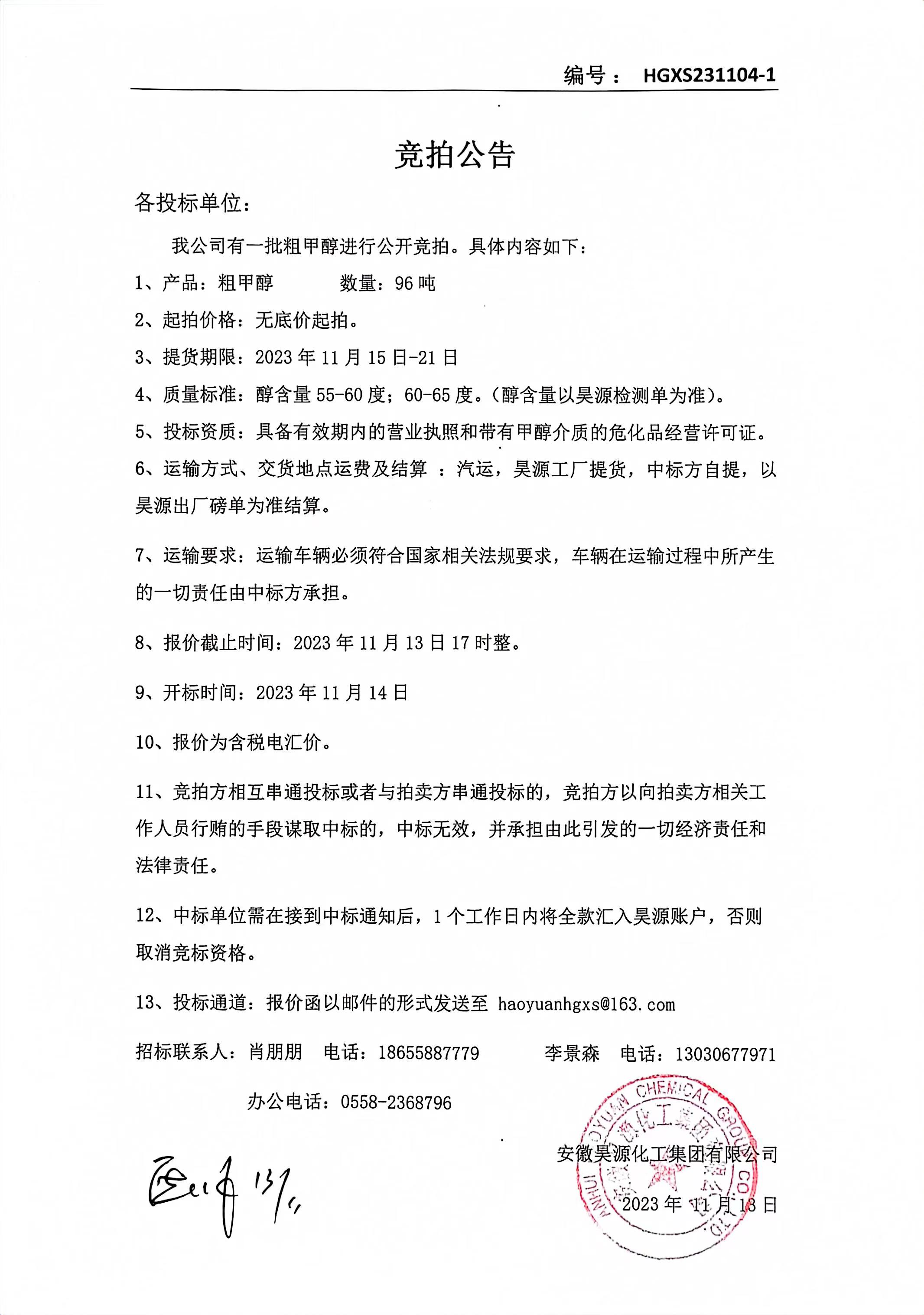 化工销售公司粗甲醇竞拍公告