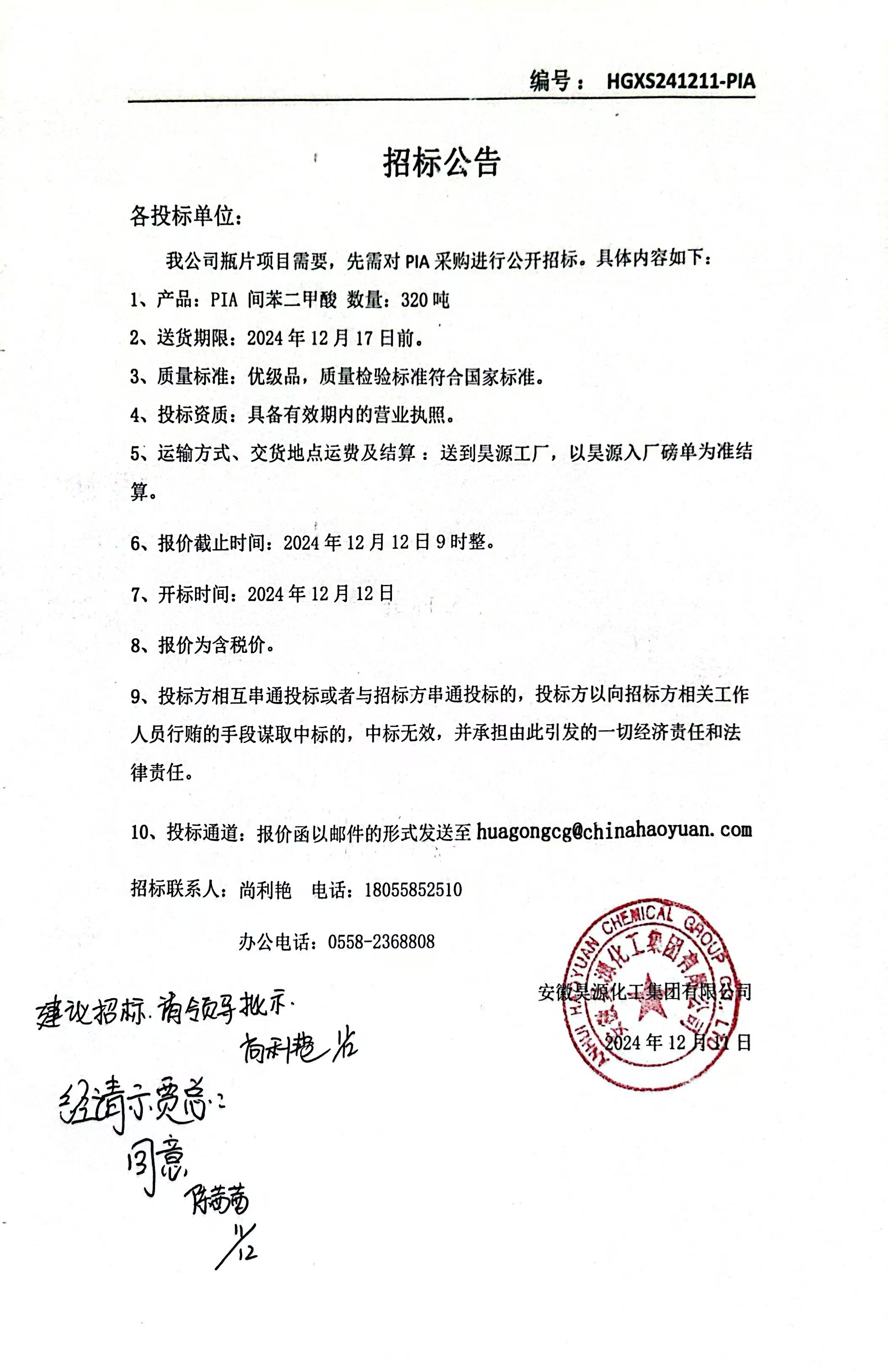 化工销售PIA采购招标公告