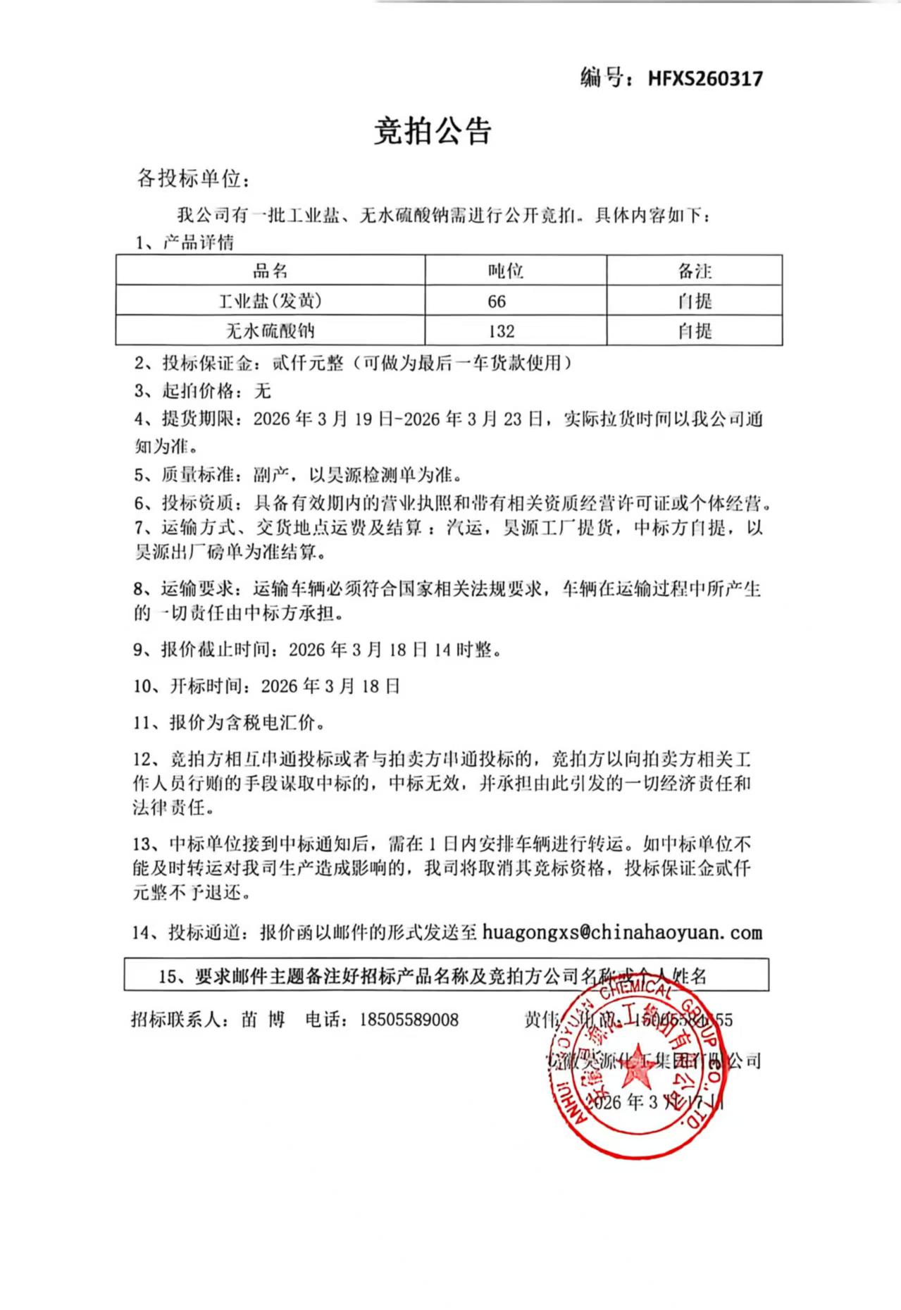 一批无水硫酸钠、工业盐招标销售公告