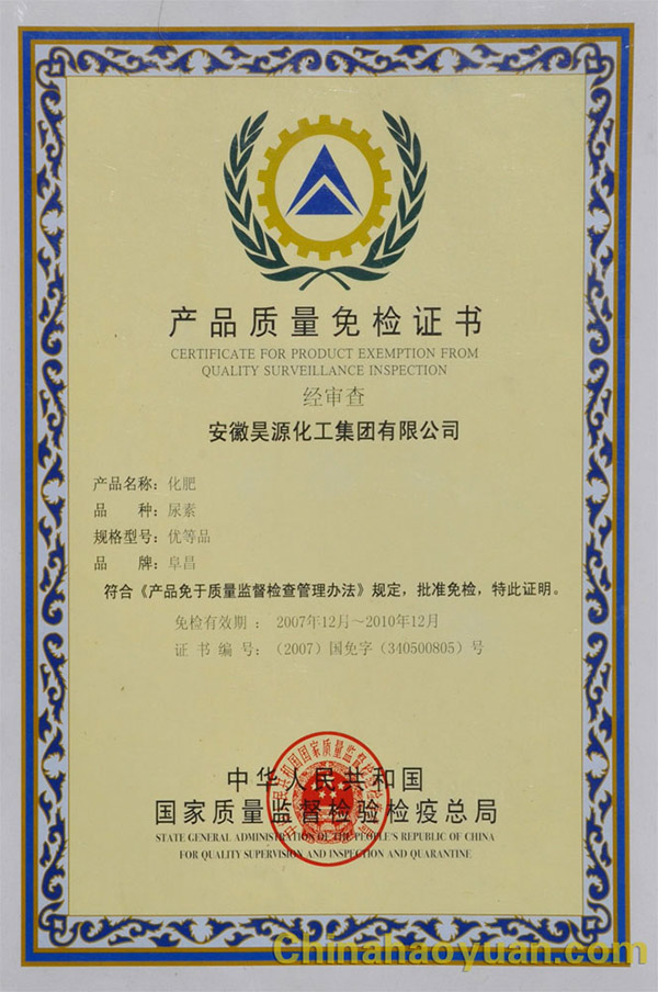 产品质量国家免检证书